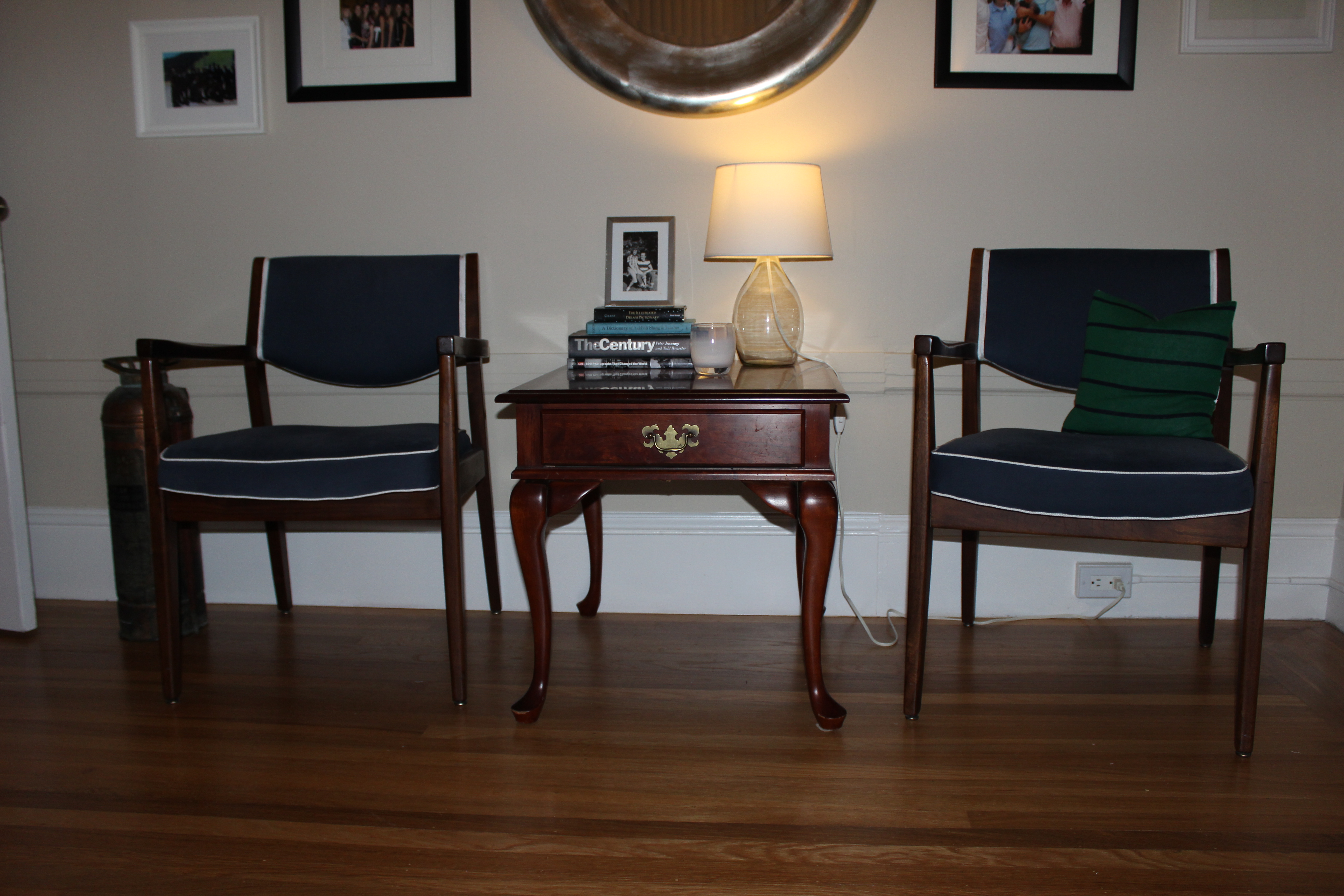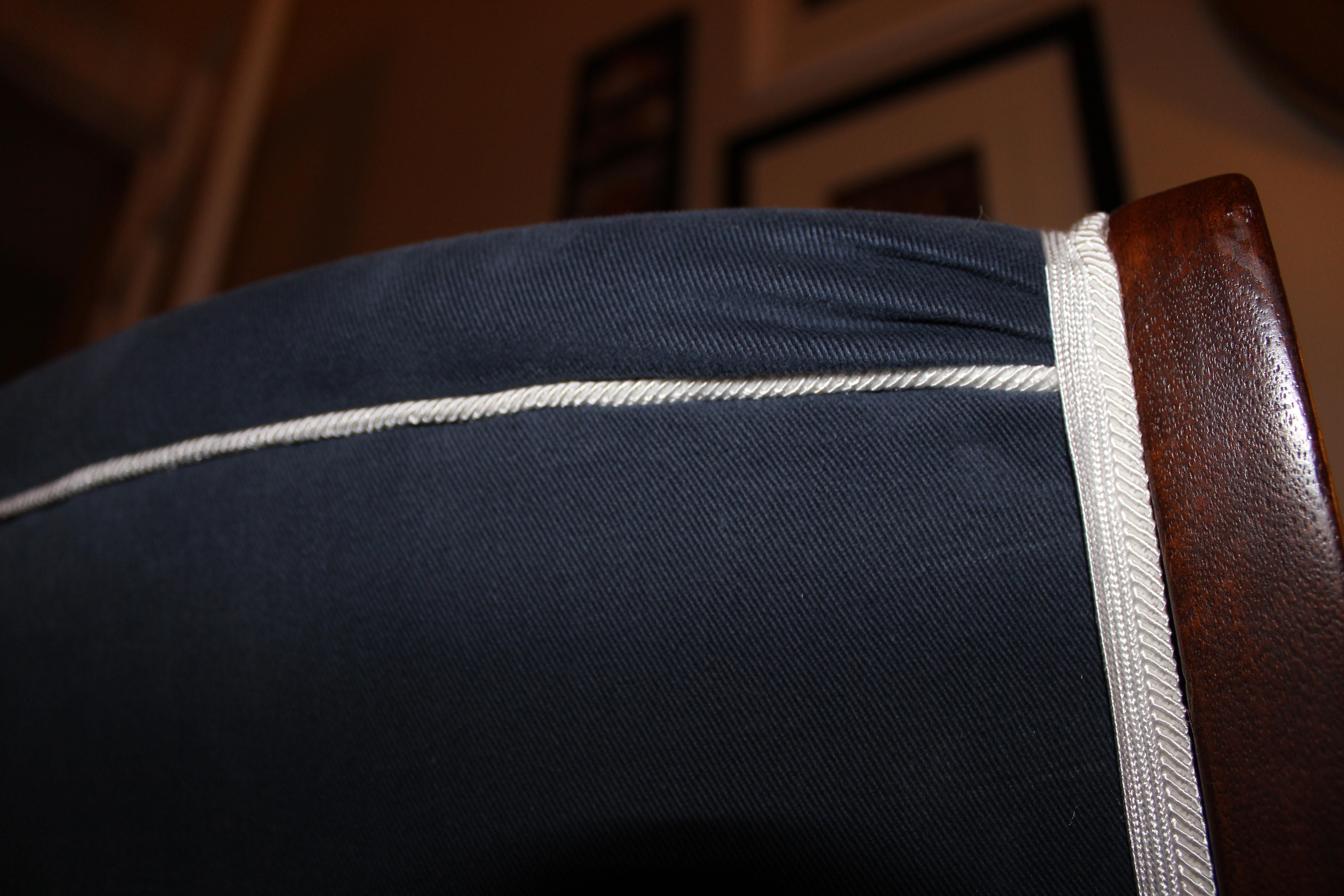 So here they are in all the mid-century glory. The contrast with the white piping and navy fabric does show the slight unevenness of my seam, but nobody is staring at the chairs for hours on end. Hopefully they’re sitting in them while conversing amongst friends! I may redo these chairs again someday. I love the classic shape and style that much. They would be fierce with a leopard print or maybe a bold floral. Perhaps it will happen when I need to take out my aggression on some old staples.