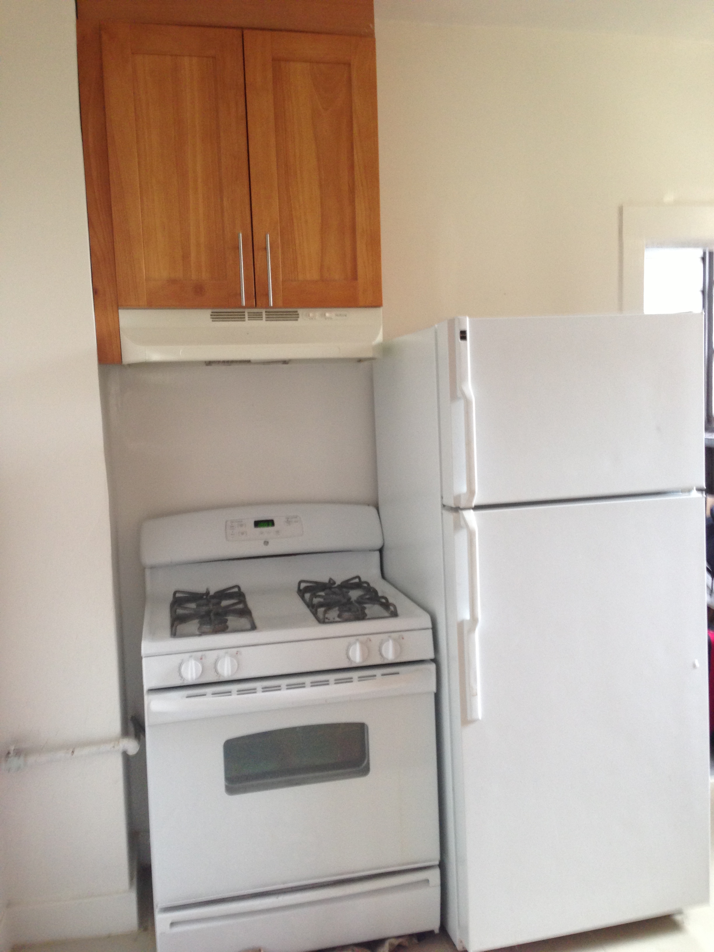 A lovely employee at Discount Builder’s Supply in San Francisco cut my wood pieces to the dimensions needed to fit the odd space created between the wall and kitchen stove. I put a couple coats of stain on the wood and called it day. Ideally this should be coated with polyurethane to seal the wood, but I was trying to finish the project before the fiancé got home. I love a good makeover surprise.