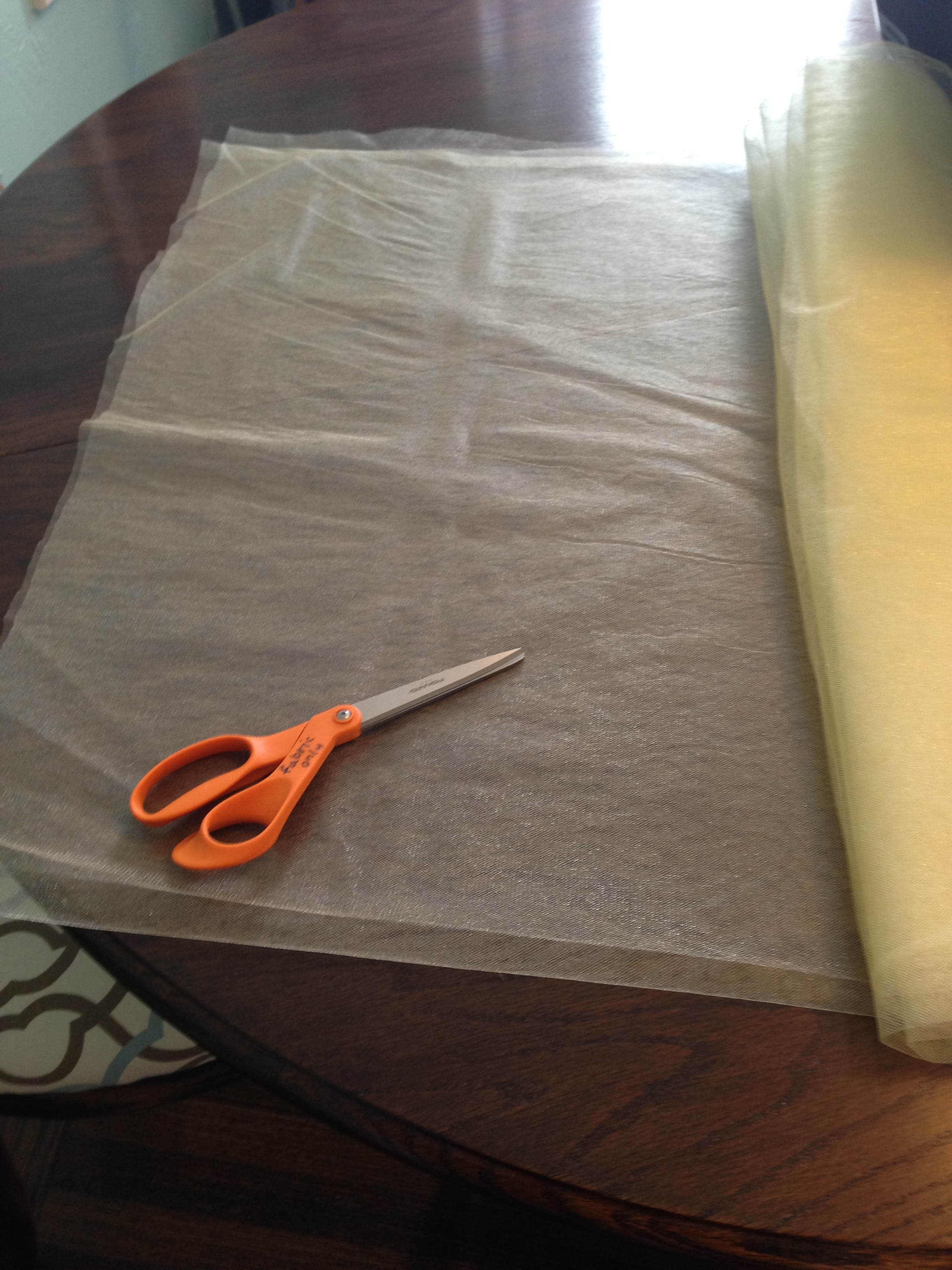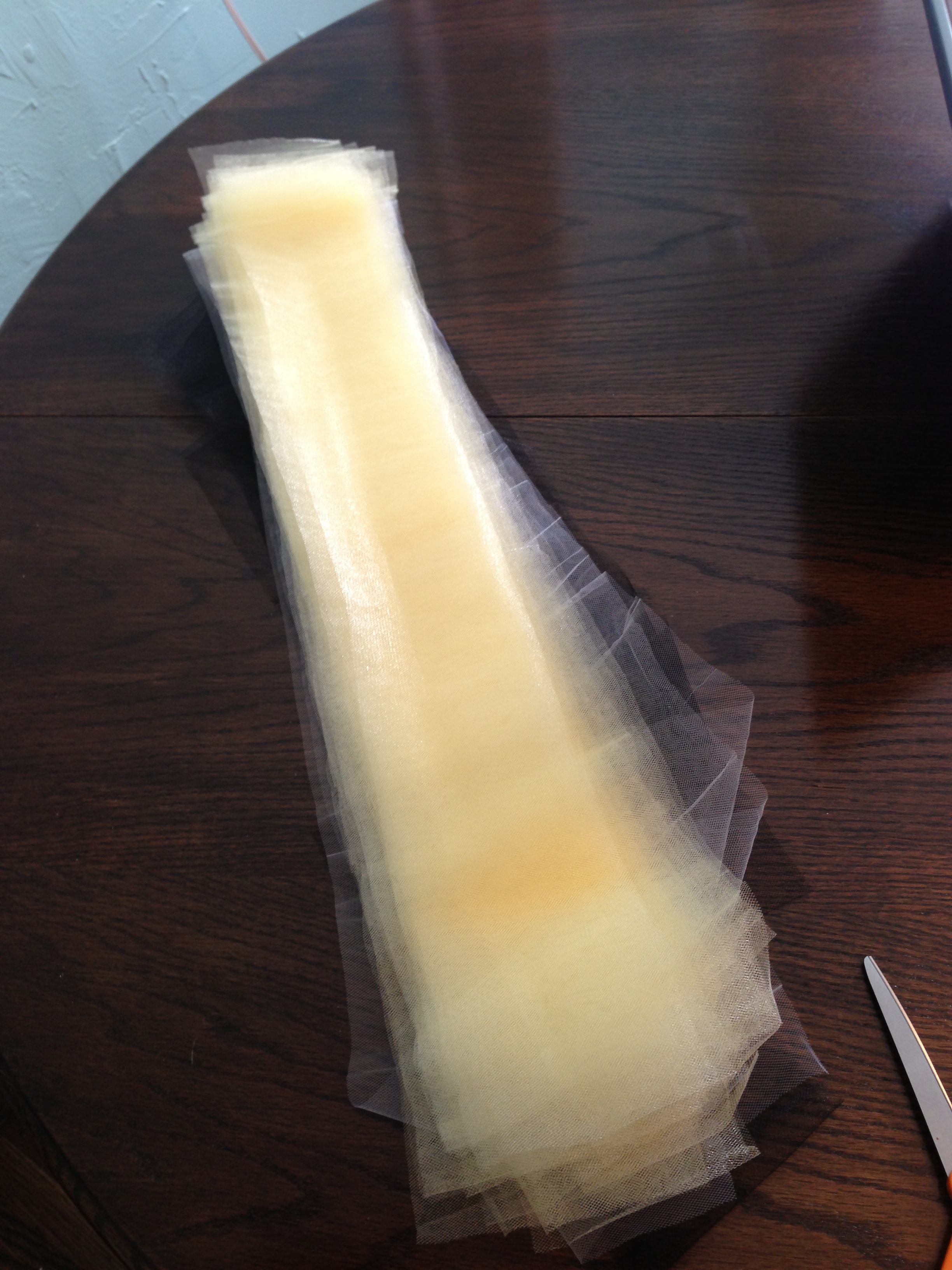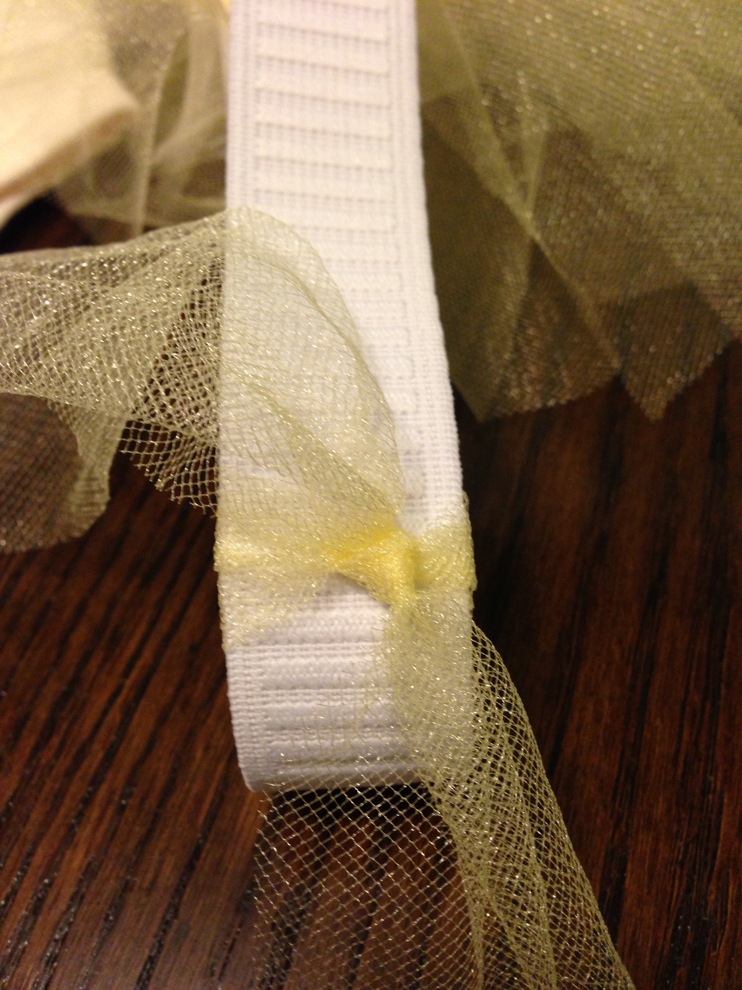 To the tulle! I always try to buy more fabric than I’ll need in order to avoid a second trip to the store mid-project… that’s THE WORST. Most likely the tulle will be folded in half when it comes off the bolt, which is great, leave it that way for cryin’ out loud cutting will go so much quicker. Next, cut the tulle into two inch strips. Now tie those buggers in double knots around the elastic and BAM! you’ve made a tutu.