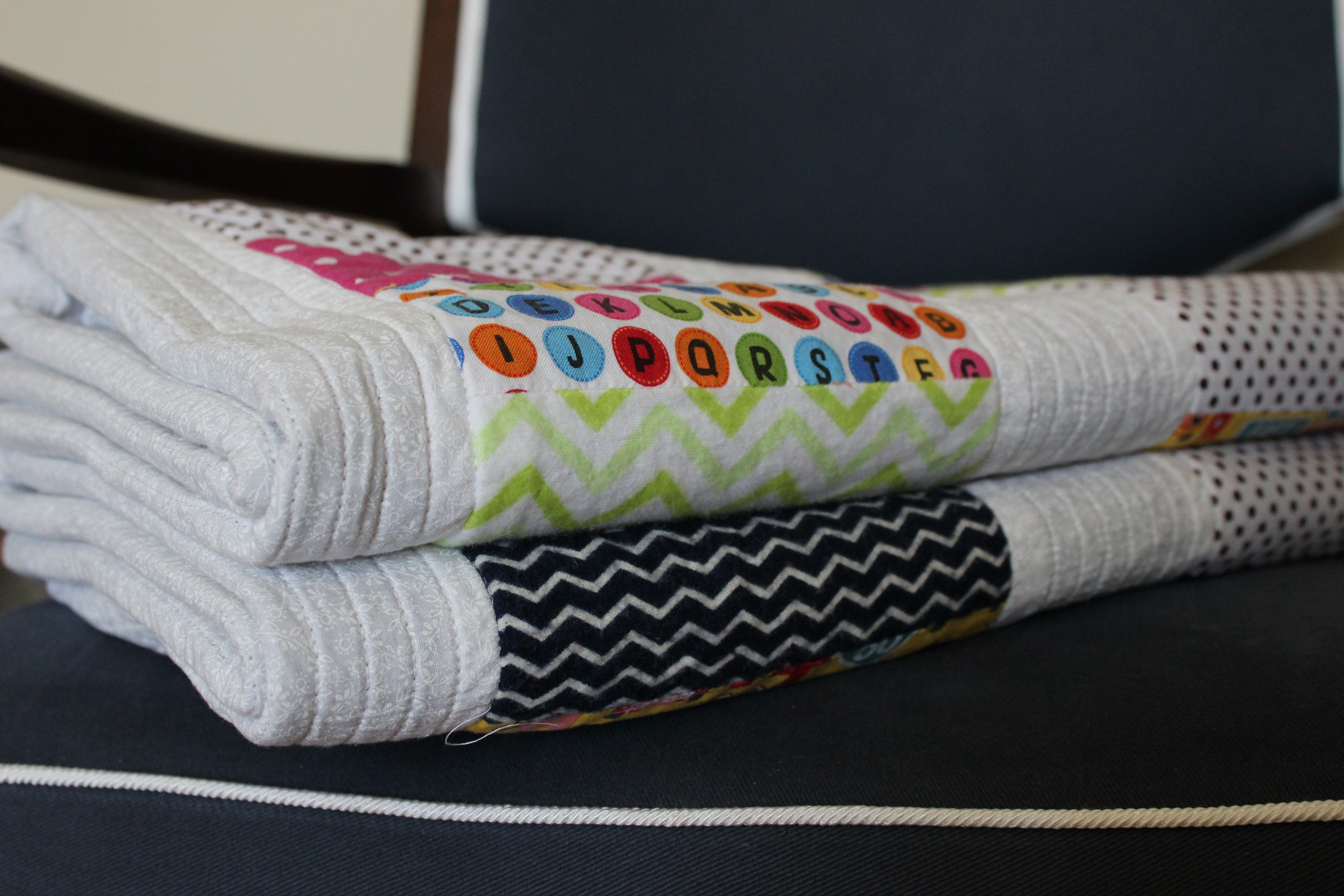 Here are the finished blankets! The boy’s has navy fabric while the girl’s has pops of pink. I like how they are similar, but distinguishable.
