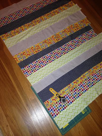 Cut some white fabric to go between your colorful strips. I cut 4.5″ strips and again used a half inch seem. There are four colorful sections and three white. You can cut your strips as wide or narrow as you like to where it totals to the finished size you so desire.